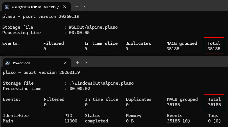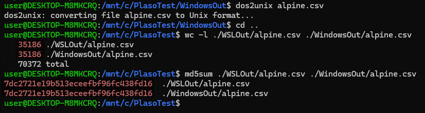 Some of you might notice the total tasks are different and are worried that the output between the two is different. Don't worry, after running both through their respective psort's, the total number of events is not only the same, but the output is a byte for byte match. The only thing I did do was run the Windows CSV through dos2unix to account for the different line endings between Linux and Windows.
