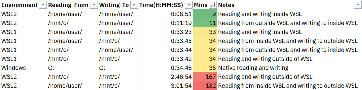 Bottom line up front, I was using WSL wrong. Hundreds of thousands of small write operations that leave the WSL2 filesystem are almost unusably slow. Reads are mostly fine, and large writes can be tolerable — but write-heavy workloads crossing that boundary are a problem. Somehow I never put this together. I have typically used my WSL instance as the place that stores the tools, and my larger Windows drive as the place that stores the data. I can write a CSV timeline to /mnt/c/wherever/ and immediately open it with TimelineExplorer—why wouldn't I do that? Turns out when I write the Plaso storage file out to /mnt/c/... I'm doing things in the worst way possible. Allow me to demonstrate how bad this is via a language we all speak: Excel.