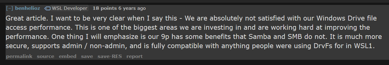 - https://www.reddit.com/r/bashonubuntuonwindows/comments/e7ce9s/filesystem_performance_comparison_between_wsl1/